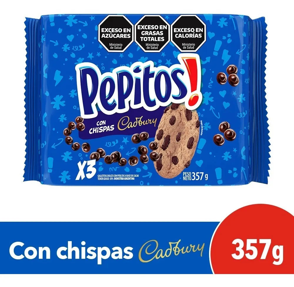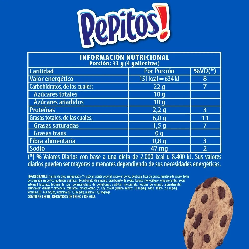Las galletitas Pepitos de vainilla con chips de chocolate son una combinacion perfecta entre una masa suave con sabor a vainilla y trocitos de chocolate que se derriten en cada bocado. Ideales para chicos y grandes, vienen en un pack de 3 paquetes de 118 g cada uno, practico para compartir o llevar a todos lados.