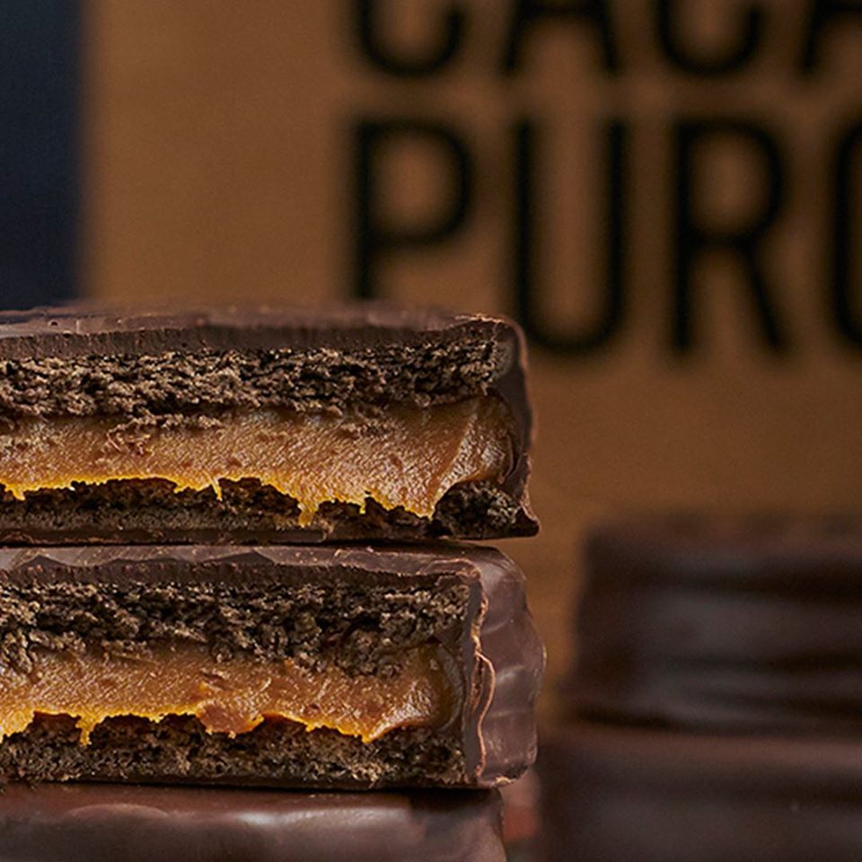 Tipo: Alfajor premium de chocolate negro 70% cacao relleno de dulce de leche